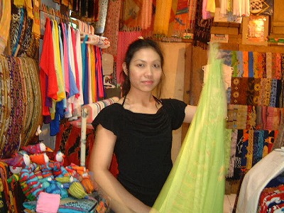 市場で衣料やバティックを売っていた女性