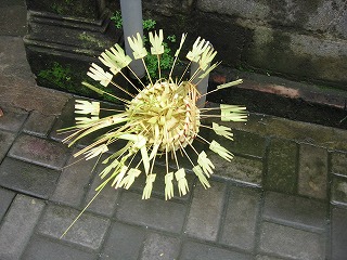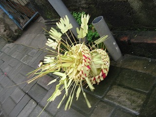 ある家の門の前にあったお供え。 本当にいろいろな形のものがある。 |