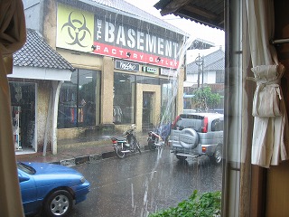 うーん 外はすごい雨。 小学生が裸足で歩いていた。 しばらく雨宿りさせてもらう。 そうだ!と思って、お店のお兄さんに 「このへんでおいしいお店ある?」ときいてみる。 「あぁそれなら」という感じで教えてくれた。 100メートルくらい、というので雨のなか出発。 |