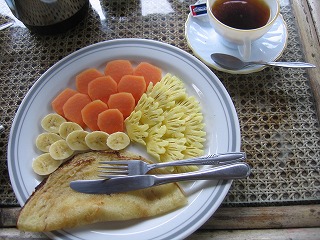 朝食。 バナナパンケーキ、パイナップルパンケーキ、ジャッフル、 オムレツ・・・ 「なにがいい?」と言われて 連れはバナナパンケーキ、私はパイナップル。 ホテルの朝食よりリッチな感じがする。 ロスメンなどに泊まると、 このキレイにカットされたフルーツに出会える。 |