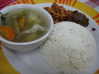 練習の途中でBapak Suwentraがそっと近寄ってきた。 「ねぇねぇお腹すいた。終わったらゴハンいきましょう。」 (笑) というわけで0時すぎ。 Bapak Suwentra、楽団メンバー数人、ちょっと都会っこ風のドラムのコ、 それにS氏と一緒に車ででかける・・・ 練習していたみんなはお腹すいてると思うんだけど 私たち・・・ |