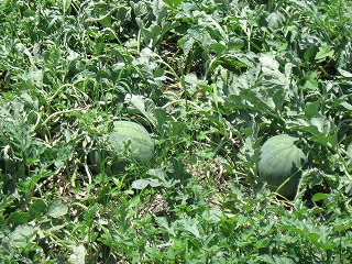 スイカもたわわに。 そこで♪スイカの名産地〜♪ なんて歌をふたりして思い出してしまった・・・ |