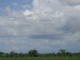 遠くにキラキラ煌くものが・・・ 写真ではよくわからないと思うけど 白鷺(だと思う)の群れが空いっぱい羽ばたいていた。 一瞬のできごとだった・・・ |