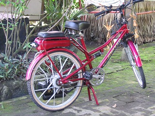 Bapak Suwentraご自慢の これぞ「原動機付自転車」!! ほんとに自転車です。 すごい煙とすごい音をさせて走ります・・・ 笑 |