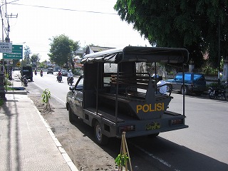 待ち合わせの美容室に戻ると 近くにPOLISIトラック。 Bapak Suwentraはシャンプーしてトリートメントして 長い髪が艶々になっていました。 コンサートに向けて身だしなみを。 |