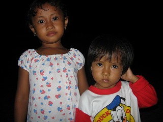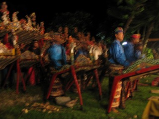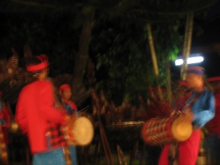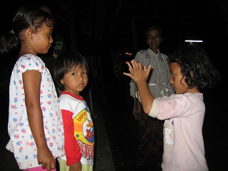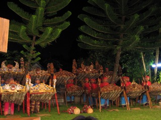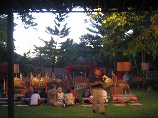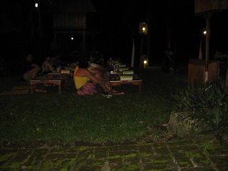 SUAR AGUNGに戻ると、コンサート準備が整っていて すでにツアーのお客さんも到着していた。 いつものんびり過ごしていた空間は お客さまをもてなすムードに変貌を遂げていた。 ツアーのおじさまおばさま、正装の私たちをみてなにやらひそひそ。 ん?ナニモノ?とか思ってますか・・・?(苦笑) ついに関西弁のおじちゃんが声をかけてきた。 えぇ日本人です。。 バリ人のガイドのお兄さんにも「バリ人かと思った」と言われる状態。。 (お世辞でもうれしい・・・。 でも連れ曰く「違和感なくバリ人」だそうで(笑)) メンバーも徐々にそろって 一緒にピサン(バナナ)とコピをいただく。 そのあとお祈り。私たちも一緒に。 私たちだって十分お客さんなんだけどね しばらく一緒に過ごしてきたせいか コンサートのためにきたお客さんたちを 迎える側に近い立場で眺めてしまっていた・・・ ちょっと変だけど。 お客さま用に用意されたバーカウンターで 私たちにはちょっと手が出ないような(苦笑)観光客値段のビールを バンバン買ってたりするんだもの。。 お祈りのあと、Bapak Suwentraをはじめみんなの表情が 変わっていく・・・ そしてコンサートが始まった。 |